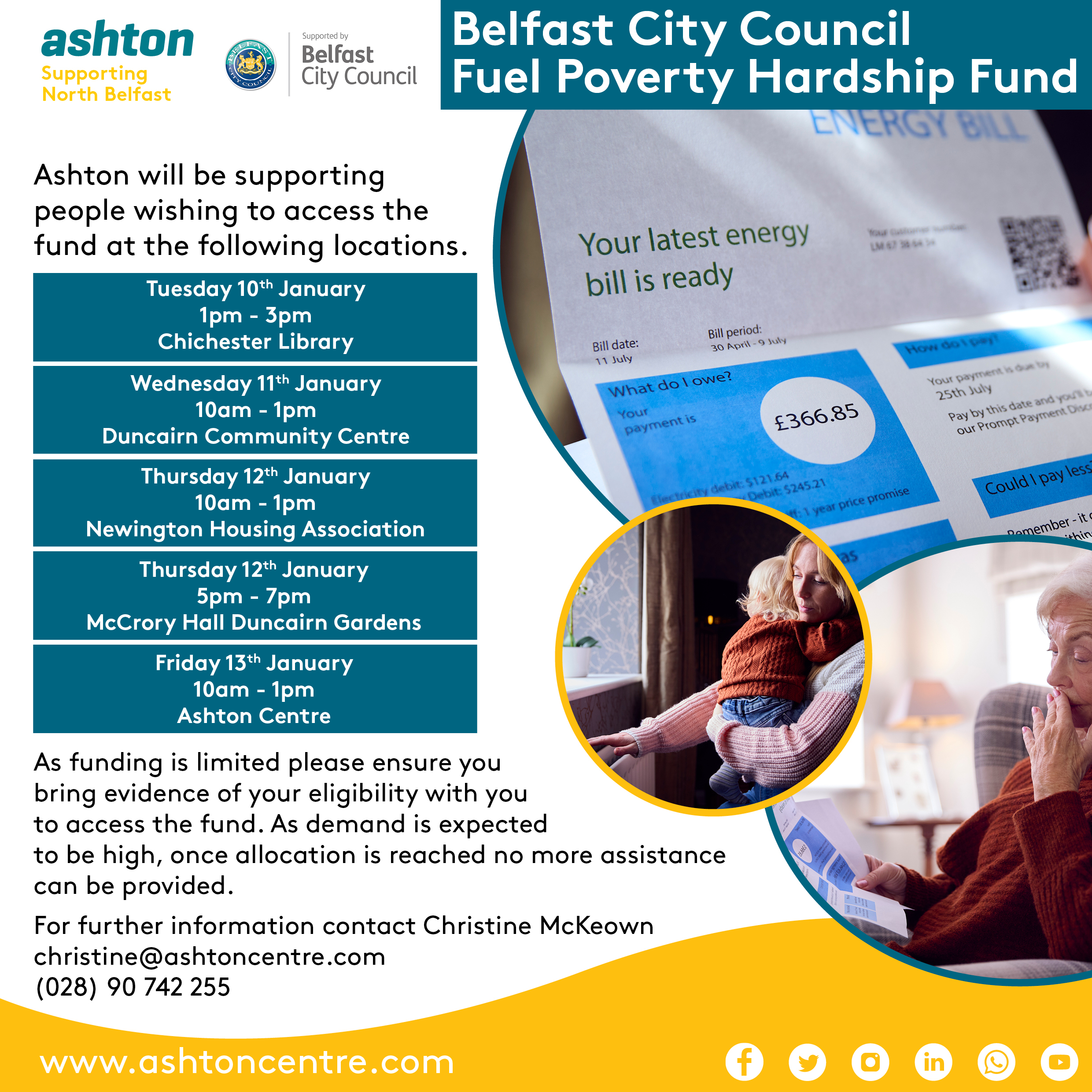 Ashton Community Trust has received funding through Belfast City Council to administer the Fuel Poverty Hardship Fund in the following Wards, New Lodge, Duncairn, Waterworks and Chichester Park.