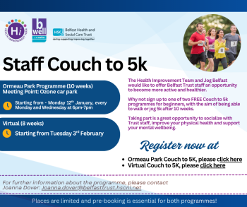 The Health Improvement Team and Jog Belfast would like to offer Belfast Trust staff an opportunity to become more active and healthier. Why not sign up to one of two FREE Couch to 5k programmes for beginners, with the aim of being able to walk or jog 5k after 10 weeks. Taking part is a great opportunity to socialize with Trust staff, improve your physical health and support your mental wellbeing.