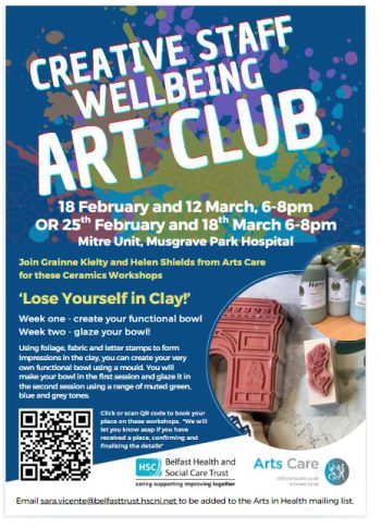 These workshops will be held in the Mitre unit, Musgrave Park Hospital, 6-8pm (see attached map). No experience necessary and all materials provided – just bring an art shirt or apron if you have one.